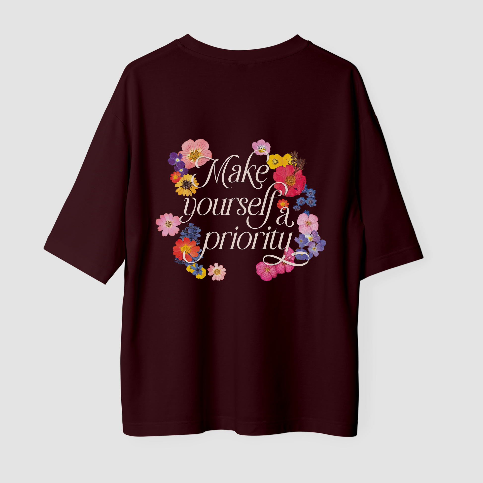 A reminder to pause, grow, and glow ✨ The Breathe Bloom Be Oversized T-shirt is designed for days when you need a little nudge to slow down and center yourself. With a chic, minimal front design and a powerful back message—“make yourself a priority”—this tee turns everyday wear into a self-care ritual. Cozy, uplifting, and effortlessly stylish, it’s a wearable affirmation to keep you grounded and glowing.